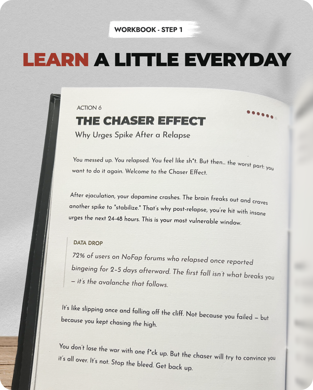 A relapse doesn’t erase your progress — it’s just a bump on the road. That’s why we’ve built clear recovery protocols to help you understand what went on in your mind, regain control of your actions, and move forward stronger.